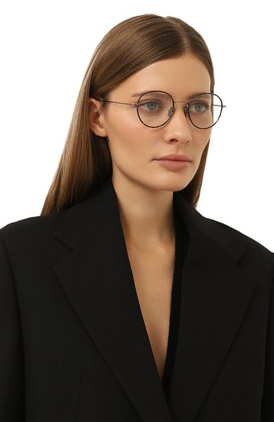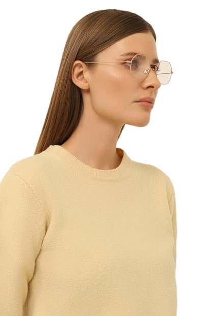 Почти невесомая узкая оправа выполнена из прочной стали с покрытием цвета розового золота. С теплым оттенком почти сливаются накладки из коричневого полимера, которые обрамляют круглые прозрачные линзы с символикой марки. Фирменная эмблема повторяется на асимметричных заушниках с отверстиями для крепления цепочки.