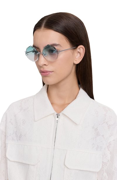Голубые градиентные линзы очков, защищающие от вредного воздействия ультрафиолета, гармонируют с серебристым цветом фигурной оправы, которую выполнили из легкого сплава. Дужки дополнили фирменными асимметричными заушниками.