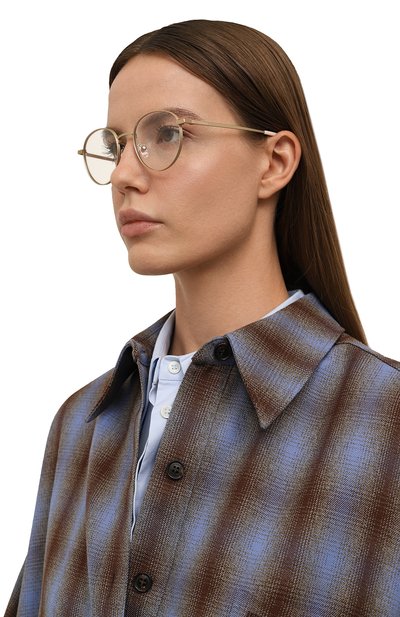 Для изготовления золотистой тонкой оправы мастера марки использовали легкий, но прочный сплав. Рамку, дужки и узкий мост украсили выгравированным узором, который подчеркнули, отполиро вав материал до глянцевого блеска. Аксессуар дополнили знаковыми для бренда асимметричными заушниками.