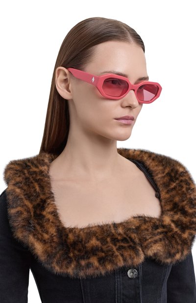 Для изготовления широкой розовой оправы солнцезащитных очков мастера марки использовали легкий прочный ацетат. Фигурные дужки декорировали золотистым логотипом, деликатно обозначив принадлежность аксессуара бренду. Однотонные дымчатые линзы обеспечивают 100% защиты от ультрафиолетовых лучей.
