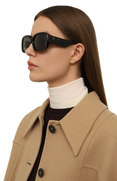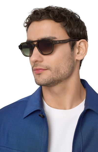 Солнцезащитные очки с объемными прямоугольными рамками подойдут и женщинам, и мужчинам. Для изготовления широкой темно-зеленой оправы мастера марки использовали легкий прочный ацетат, отполированный до глянцевого блеска. Темно-серые линзы из устойчивого к царапинам поликарбоната блокируют 100% ультрафиолетовых лучей.