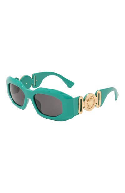 Широкую оправу крупных солнцезащитных очков выполнили из легкого ацетата, окрашенного в насыщенный бирюзовый оттенок. С ним гармонируют золотистые вставки, в которых зашифровали изображение горгоны Медузы, ставшее знаковым для бренда. Дымчатые линзы блокируют вредное ультрафиолетовое излучение, не искажая цветопередачу.