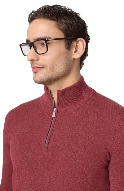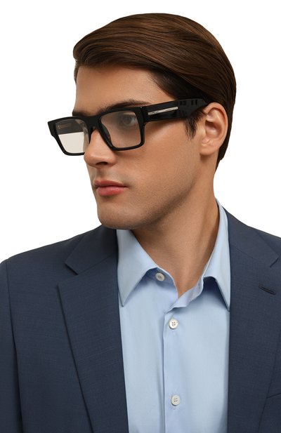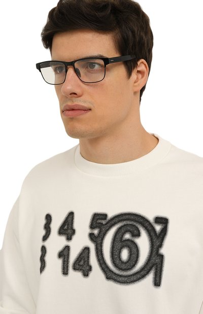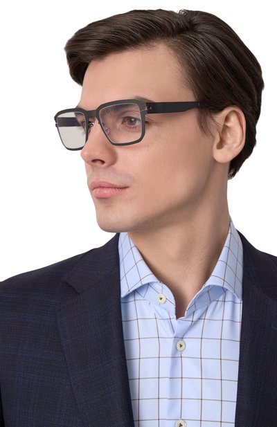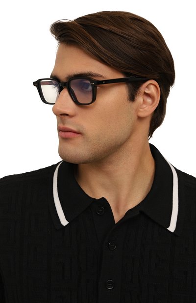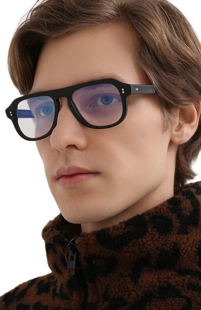 Оправа выполнена вручную из прочного глянцевого ацетата. Широкие дужки лаконичного аксессуара украсили едва заметным узором и логотипами марки.