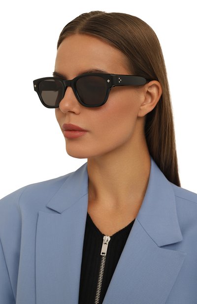 Солнцезащитные очки мастера марки изготовили из гладкого легкого ацетата. Роль декора отдали золотистым фигурным накладкам, украсив ими дужки. Аксессуар дополнили линзами в тон, которые полностью блокируют ультрафиолет и сохраняют четкость изображения.