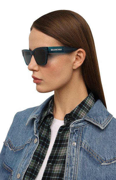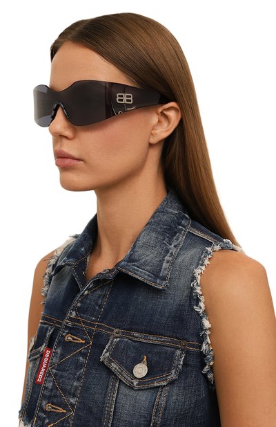 Узкая темно-голубая монолинза формирует динамичный силуэт этих безободковых очков и надежно защищает глаза от солнечных лучей. Ее линии продолжаются в широких дужках из такого же прозрачного полимера в тон. Левую подчеркивает крупный белый логотип бренда, а его миниатюрная версия просвечивает сквозь правую.