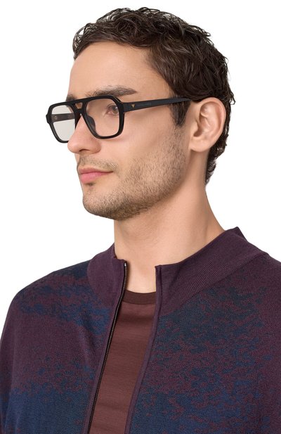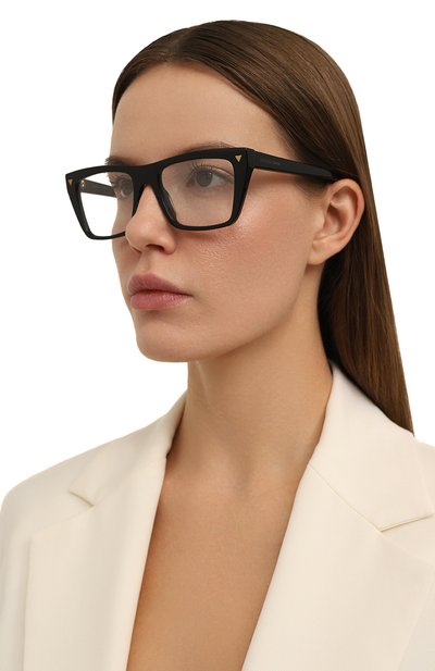Для изготовления черной оправы использовали легкий прочный ацетат, отполированный до деликатного блеска. Верхние углы рамки декорировали миниатюрными вставками в виде знакового для марки треугольника. Такой аксессуар гармонично впишется в лаконичный образ.