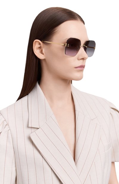 Безободковые очки выполнили из металла с гальваническим покрытием золотом. Аксессуар с брендированными ацетатными заушниками дополнили градиентными поляризационными линзами с фирменным паттерном из переплетенных литер С. Модель с фигурными основаниями дужек подойдет и женщинам, и мужчинам.
