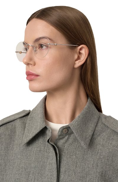Безободковую металлическую оправу из коллекции Signature C de Cartier дополнили регулируемыми носоупорами. Крепления дужек подчеркнули вставками с эмблемой бренда, которым вторит логотип на заушнике.