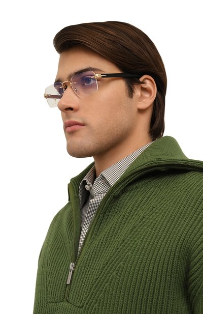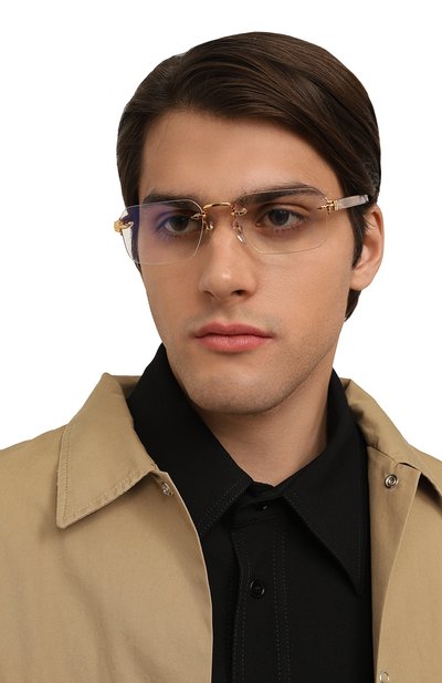 Сдержанная безободковая оправа способна вписаться в любой образ. Изделие выполнили из легкого сплава с золотистым покрытием, а заушники — из полупрозрачного полимера. Дужки декорировали эмблемой бренда и деталью, похожей на клип шариковой ручки.