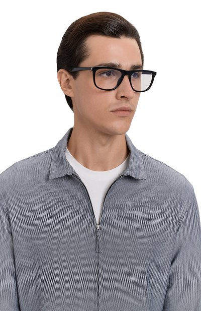 Команда марки усилила строгость оправы формы cat eye, сделав обычно плавные линии более геометричными. Слегка измененный силуэт повторяют прозрачные линзы, а принадлежность бренду подчеркивает монограмма Кассандра над петлями дужек. Блеск металлического декора кажется ярче на контрасте с черным ацетатом.