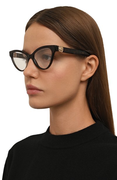 Оправу формы cat eye мастера марки, основанной Ивом Сен-Лораном, изготовили из премиального итальянского ацетата, устойчивого к повреждениям. Черные и коричневые пигменты словно запечатаны внутри материала, поэтому изделие не потеряет цвет со временем. Дужки аксессуара декорировали логотипом бренда.