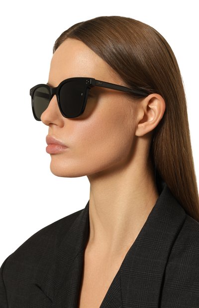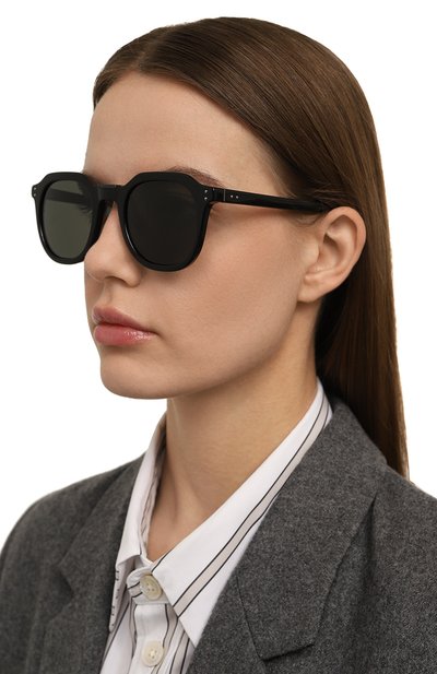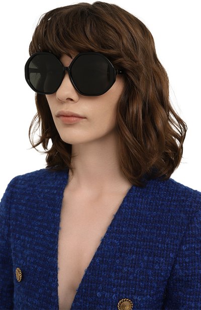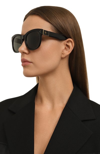 Черные солнцезащитные очки с золотистым логотипом изготовили из глянцевого ацетата. Материал считается одним из самых легких и прочных, поэтому аксессуар прослужит долго. Дымчатые линзы из поликарбоната на 100% блокируют вредное ультрафиолетовое излучение, не снижая качества изображения.