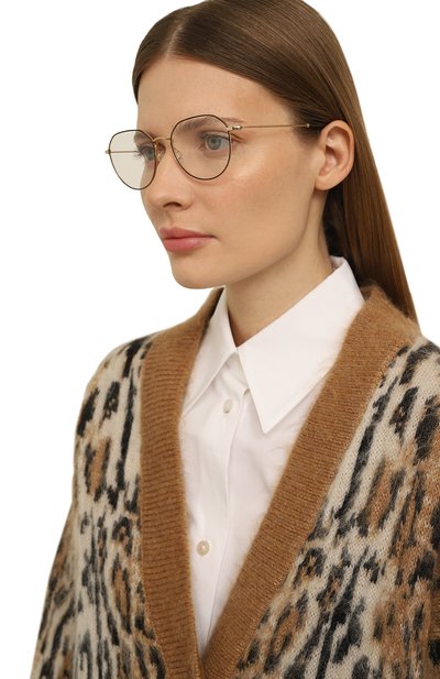 Мастера марки изготовили оправу из тонкого прочного металла с золотистым напылением. Узкие дужки дополнили заушниками из легкого ацетата, отполированного до глянцевого блеска. Такой аксессуар с подвижными носоупорами комфортно садится и почти не ощущается на лице.