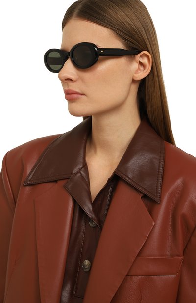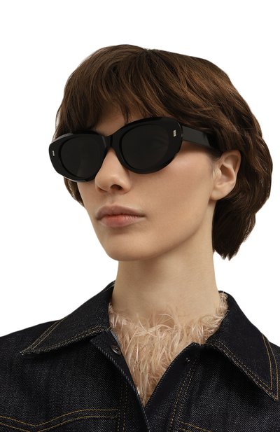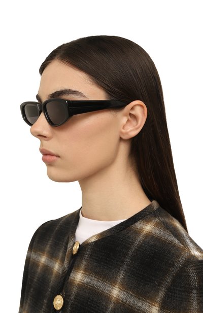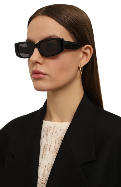Роль декора у этих черных солнцезащитных очков отдали крупной фигурной оправе. Несмотря на широкую рамку, аксессуар не давит на переносицу: гладкий ацетат делает изделие достаточно легким, чтобы с комфортом носить его в течение дня. Дымчатые линзы на 100% блокируют вредный ультрафиолет.