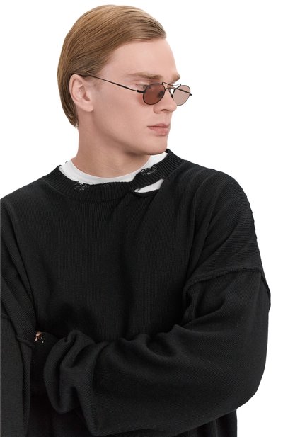 Эти солнцезащитные очки одинаково хорошо подходят и женщине, и мужчине. Для изготовления тонкой оправы мастера марки использовали полированный легкий титан с покрытием черного цвета. Небольшие оранжевые линзы овальной формы надежно блокируют вредные ультрафиолетовые лучи.