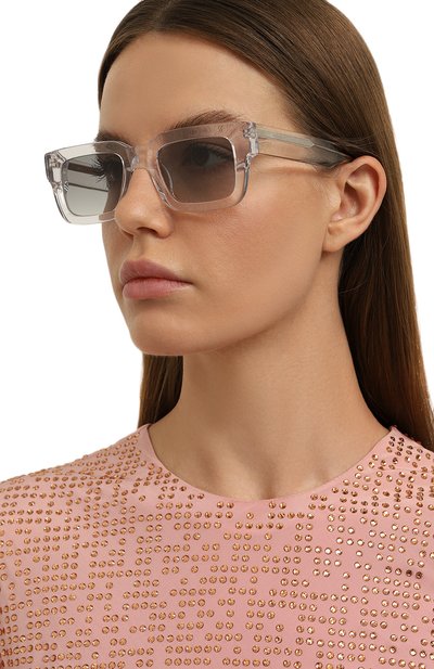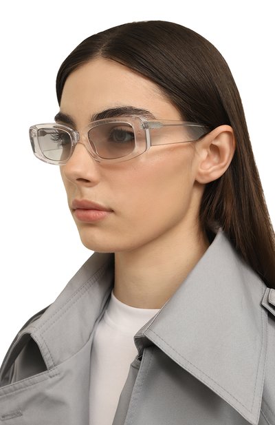 Лаконичный дизайн полупрозрачных очков адаптирует их и для мужского, и для женского гардероба. Для изготовления аксессуара использовали легкий и прочный ацетат Mazzucchelli, отполированный до идеальной гладкости. Светло-серые линзы защищают глаза от вредного ультрафиолета не хуже классических темных.