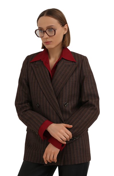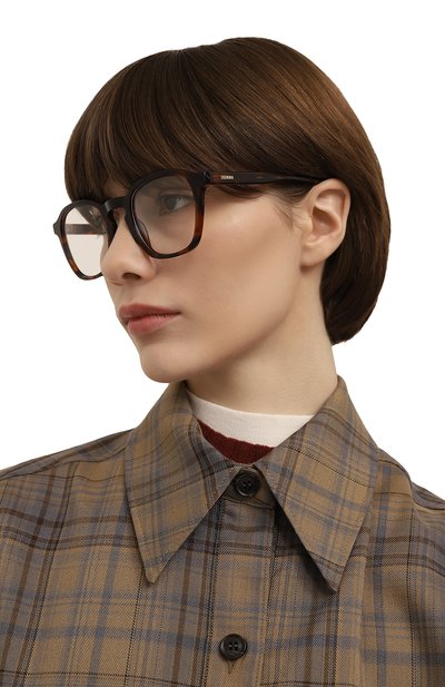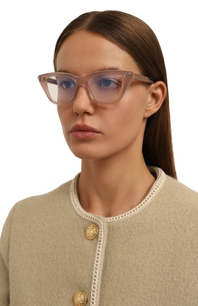 Оправа формы cat eye, вдохновленная очками из 1960-х, почти ничего не весит и не ощущается на лице. Светло-розовый оттенок и полупрозрачная фактура глянцевого ацетата, из которого изготовили аксессуар, делает его максимально лаконичным. Чтобы модель прослужила дольше, фигурные дужки на пару тонов темнее усилили вставками из тонкого металла.