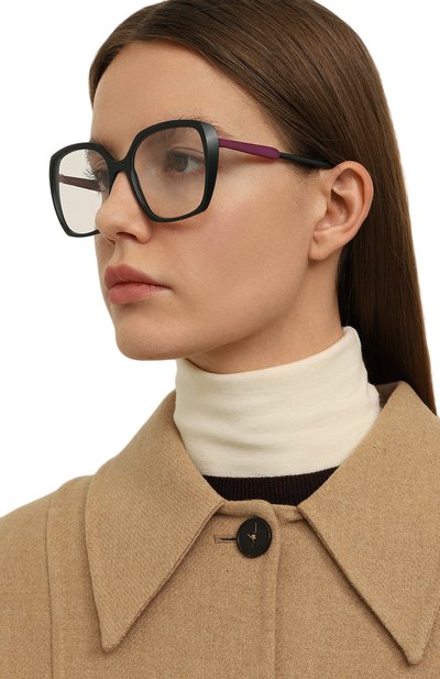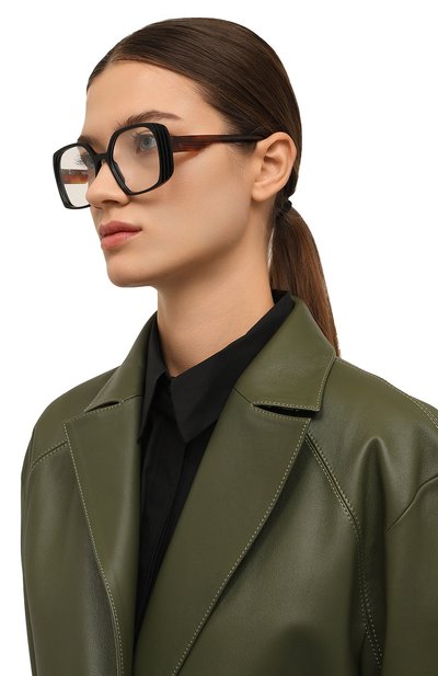 Для изготовления широкой квадратной оправы мастера марки использовали гладкий глянцевый ацетат двух оттенков. Рамки с многослойным эффектом выполнили из черного материала, а сужающиеся к концам дужки – из коричневого с черепаховым мотивом. Небольшие фигурные заушники украсили золотистым узором в виде эмблемы бренда.