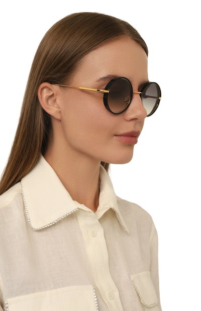 Мастера бренда выполнили солнцезащитные очки из прочного легкого сплава, который покрыли слоем 22-каратного розового золота. Теплый блеск отполированных деталей усилили, подчеркнув ободы элементами из черного глянцевого ацетата. Аксессуар с градиентными линзами дымчатого оттенка не искажает цветопередачу и защищает от вредного ультрафиолета.