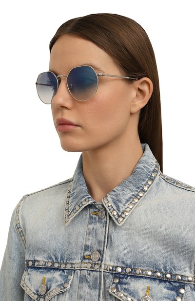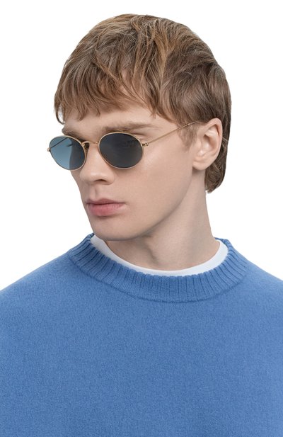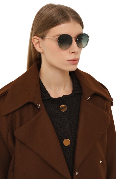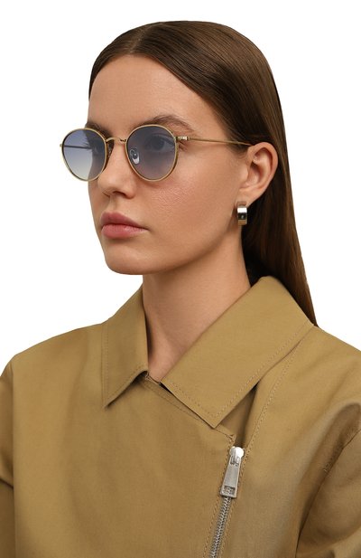 Солнцезащитные очки с голубыми градиентными линзами, блокирующими ультрафиолет и сохраняющими четкость изображения и в яркий день, и в сумерки, подойдут и мужчине, и женщине. Для изготовления аксессуара с тонкими ободами, не загораживающими обзор, использовали легкий прочный металл. Модель дополнили заушниками из черепахового ацетата.
