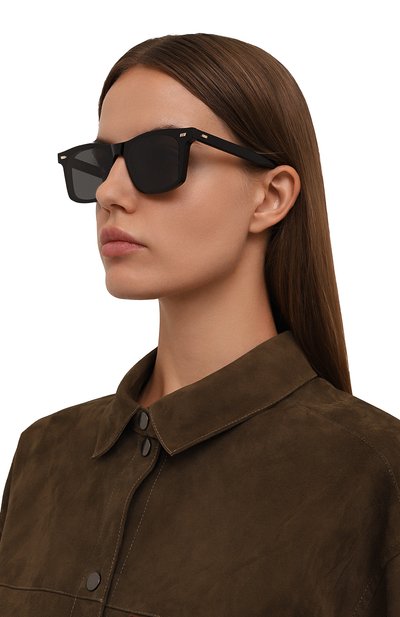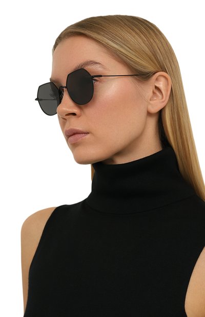 Черные очки получились почти невесомыми. Такими их делает не только тонкая оправа, но и легкий сплав. Модель дополнили затемненными линзами в тон, у которых предусмотрели антибликовое покрытие, поэтому в аксессуаре будет максимально комфортно ярким солнечным днем.