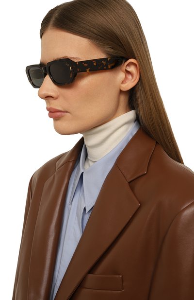 Темно-коричневые солнцезащитные очки мастера марки традиционно изготовили вручную, тщательно подогнав каждую деталь. Для производства аксессуара с черепаховым мотивом использовали прочный ацетат, который делает изделие почти невесомым. Модель, подходящую как женщине, так и мужчине, дополнили дымчатыми линзами с внутренним антибликовым пок рытием.