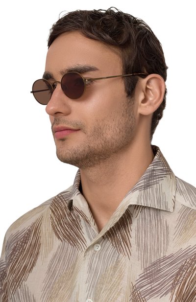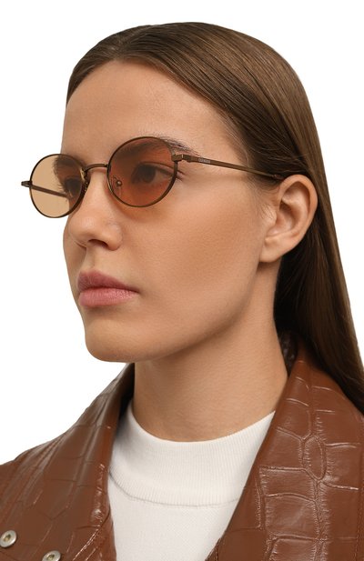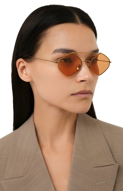 Оранжевые солнцезащитные очки мастера марки выполнили из легкого сплава. Круглую рамку и заушники изготовили из гладкого ацетата с черепаховым мотивом. Линзы из прочного нейлона на 100% защищают глаза от ультрафиолетового излучения.