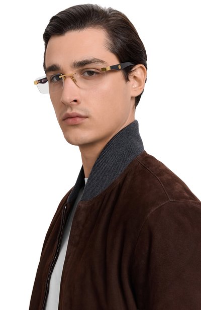 То, что аксессуар может сделать повседневный комплект более эффектным, команда марки доказала на примере этой золотистой оправы. Безободковую модель выполнили из легкого прочного титана с гальваническим покрытием, которое делает гравировку и квадратные вставки на узких дужках и мосту объемнее. Усилили это впечатление черн ые заушники из глянцевого ацетата.