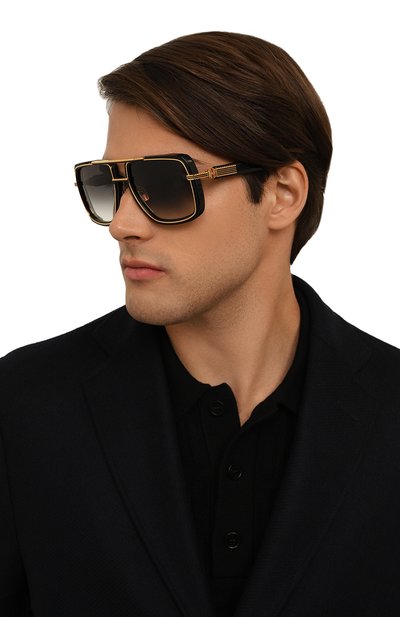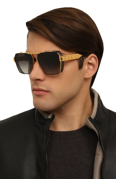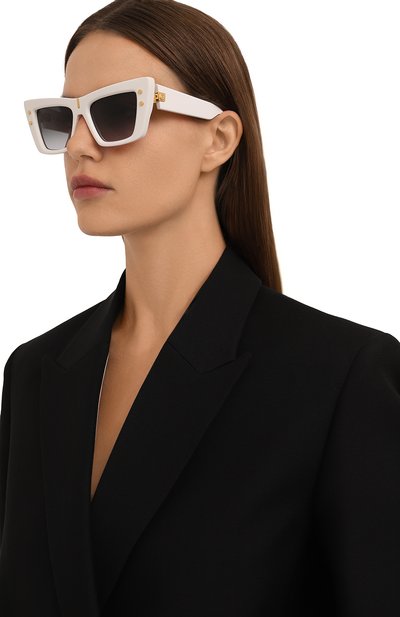 Белые солнцезащитные очки с широкими скульптурными ободами добавят стилистику ретро и женскому, и мужскому образу. Выразительность модели придают золотистые крупные вставки в форме звеньев цепи с выгравированным логотипом на широких дужках. Для изготовления аксессуара с коричневыми градиентными линзами использовали легкий глянцевый ацетат.