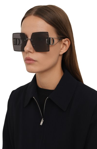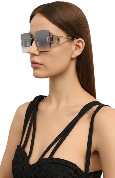Принадлежность этих солнцезащитных очков марке обозначили крупной эмблемой, которой украсили широкие ажурные дужки. Для изготовления безободковой оправы использовали легкий сплав с золотистым покрытием. Крупные квадратные линзы темно-синего цвета выполнили из прочного поликарбоната.