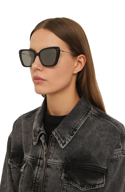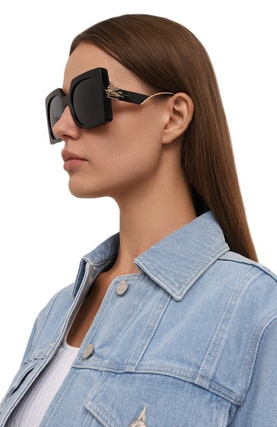 Металлические дужки этих очков с надежной защитой глаз от ультрафиолета кажутся почти невидимыми на контрасте с широкой оправой из черного ацетата. Узкие детали выдают себя лишь легким блеском и креплениями, которые превратились в деликатный акцент рядом с крупными темно-серыми линзами.