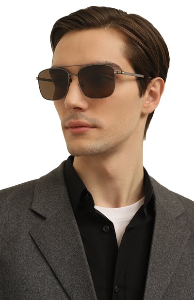 Ободы, геометричный узкий мост и тонкие дужки солнцезащитных очков мастера марки изготовили из прочного легкого титана с золотистым гальваническим покрытием. В тон коричневым линзам, защищающим глаза от ультрафиолета, выполнили полупрозрачные ацетатные заушники. Лаконичный дизайн делает аксессуар одинаково подходящим как мужчине, так и женщине.