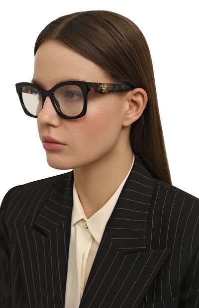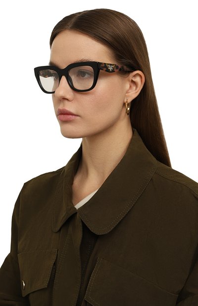 Широкую оправу формы cat eye мастера бренда выполнили из гладкого черного ацетата, который всегда остается теплым на ощупь. Дужки акцентировали черепаховым мотивом на полупрозрачном розовом фоне. За внимание он не спорит с деликатным белым логотипом марки.