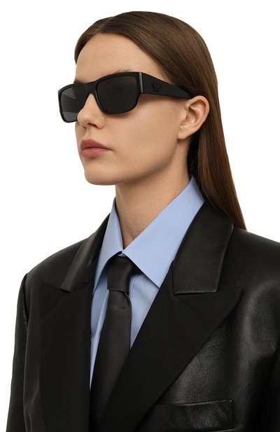 Для производства широкой черной оправы очков в форме cat eye мастера марки использовали легкий прочный ацетат, который долго не потеряет глянцевый блеск. Ажурные дужки из металла с матовым покрытием в тон украсили крупным логотипом из архивов 1990-х. Однотонные темно-серые линзы из устойчивого к потертостям нейлона обеспечивают 100% защиты от вредных для глаз УФ-лучей.