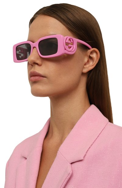Для изготовления широкой ярко-розовой оправы больших квадратных очков мастера марки использовали легкий прочный ацетат, который всегда остается теплым на ощупь. Дужки декорировали ажурным узором в виде логотипа из архивов 1990-х. Однотонные темно-серые линзы обеспечат 100% защиты от ультрафиолетовых лучей и в городе, и на морском побережье.