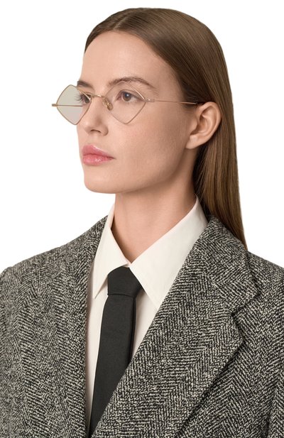 Металлическую оправу формы «авиатор» дополнили демонстрационными линзами, блокирующими лучи синего спектра. Петли дужек декорировали литерой T, а полимерные заушники с черепаховым узором – миниатюрными брендированными пластинами.