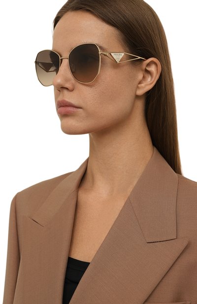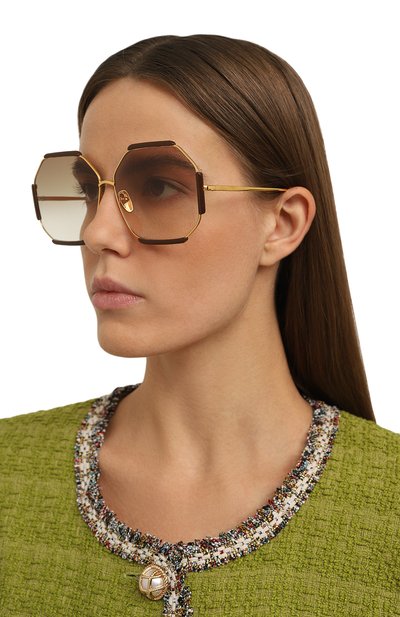 Большие очки в форме крыльев бабочки одинаково хорошо подойдут и женщинам, и мужчинам. Для изготовления тонкой оправы мастера марки использовали легкий прочный металл с золотистым покрытием. Ажурные дужки, закрепленные в верхней части рамок, декорировали фирменным треугольником с выгравированным логотипом. Градиентные светло-коричневые линзы обеспечат 100% защиты от ультрафиолетовых лучей.