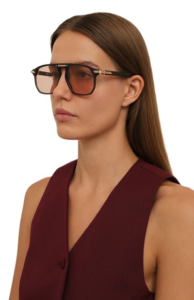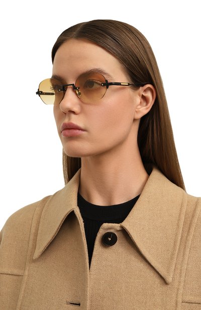 Небольшие овальные очки с подвижными носоупорами подойдут и женщинам, и мужчинам. Для изготовления тонкой оправы использовали прочный полированный металл с блестящим золотистым покрытием. Фигурные дужки с выгравированным логотипом дополнили заушниками из теплого на ощупь гладкого черепахового ацетата янтарного оттенка. Однотонные светло-оранжевые линзы защищают от ультрафиолетовых лучей не хуже классических темных.