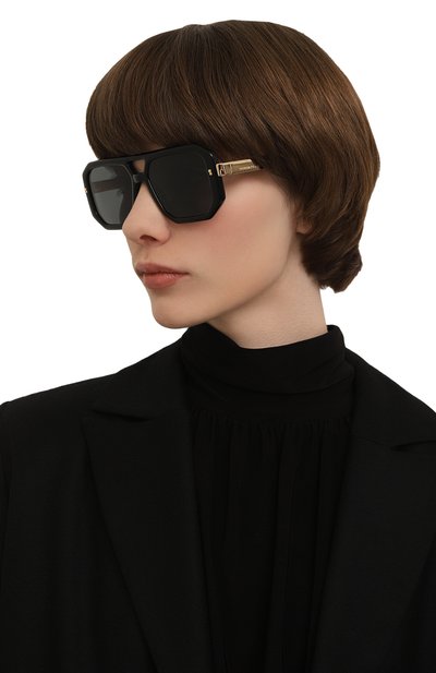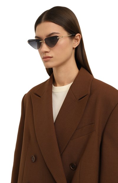 Для изготовления безободковых солнцезащитных очков мастера бренда использовали легкий сплав, отполированный до глянцевого блеска. Основаниям узких дужек придали форму эмблемы марки, которую поддержали вставками в виде фирменного кленового листа на заушниках. Аксессуар дополнили черными линзами, надежно блокирующими вредные УФ-лучи.