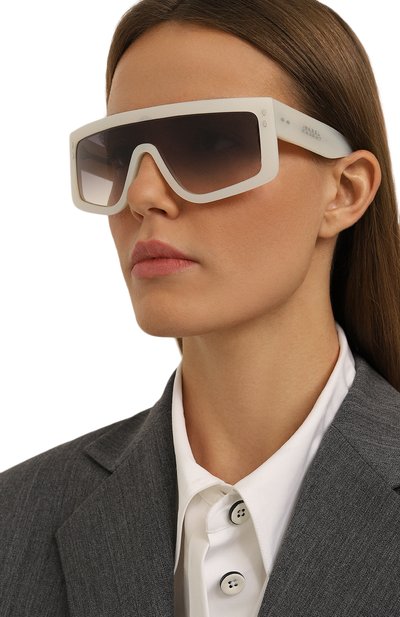 Для изготовления крупных солнцезащитных очков с фиолетовой оправой мастера марки использовали легкий полупрозрачный ацетат с глянцевым блеском. Аксессуар дополнили дымчатыми градиентными линзами, которые надежно защищают глаза от вредного излучения и не искажают цветопередачу.