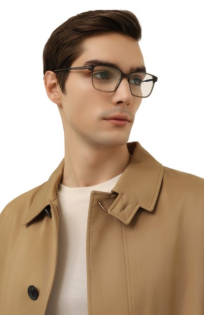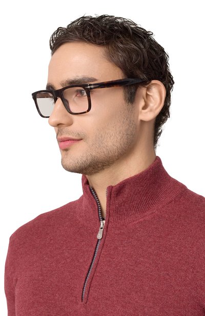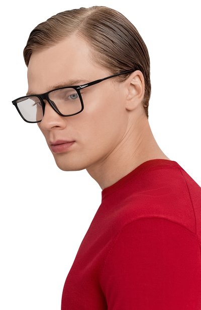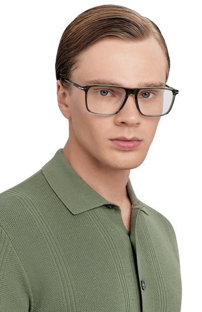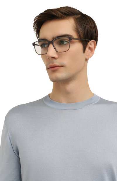 Оправу с литыми носоупорами выполнили из ацетата. Дужки модели украсили логотипом марки, в тон которому – вставки на заушниках.
