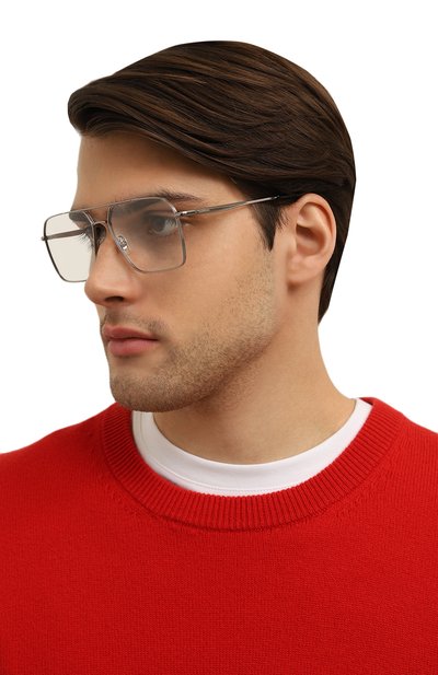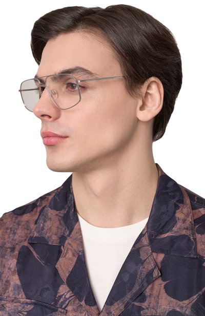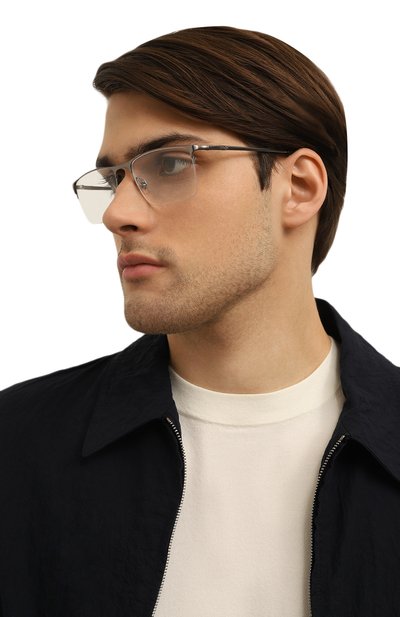 Тонкая безободковая оправа для прямоугольных линз получилась предельно лаконичной и будет почти незаметна на лице. Для изготовления аксессуара с подвижными носоупорами использовали легкий прочный титан, который не потеряет форму со временем. Узкие дужки отделали полупрозрачным материалом, всегда остающимся теплым на ощупь.