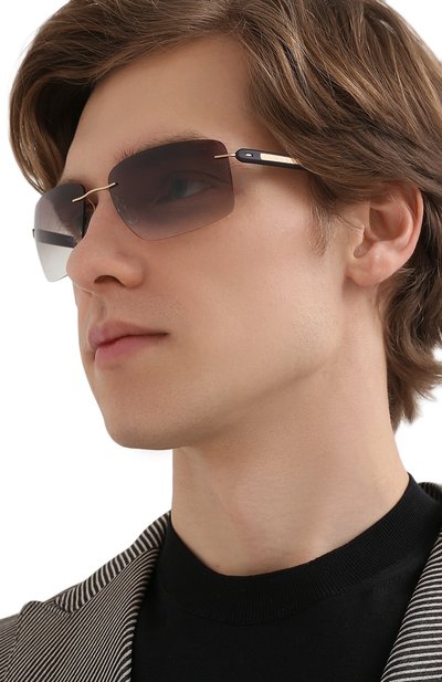Оправу солнцезащитных очков формы «авиаторы» мастера марки выполнили из прочного легкого титана с золотистым покрытием. Для отделки дужек использовали детали из пластичного материала и фактурного карбона. Аксессуар с градиентными поляризованными линзами черного цвета сглаживает блики и блокирует ультрафиолетовое излучение.