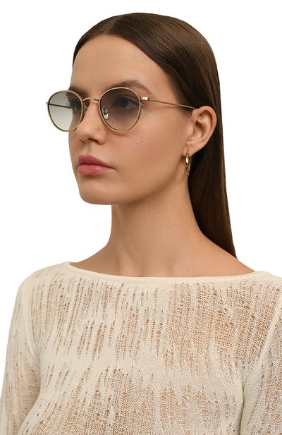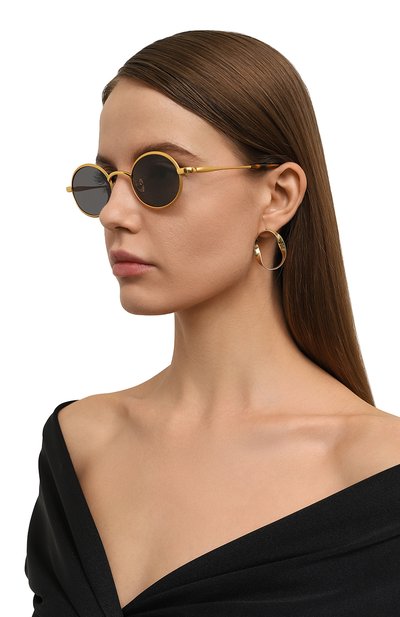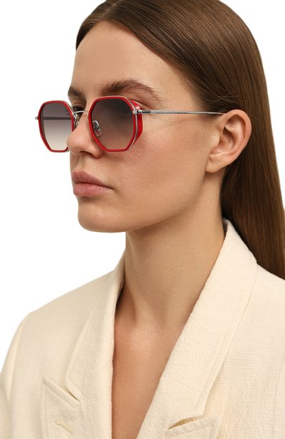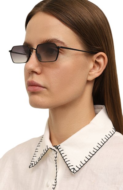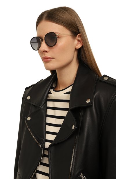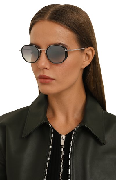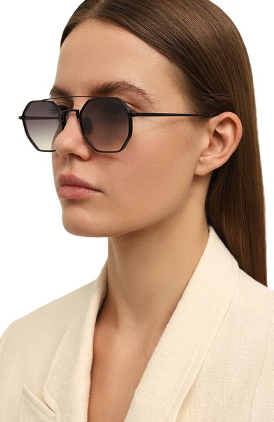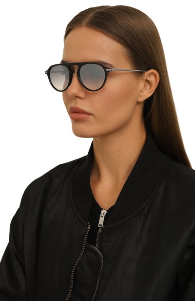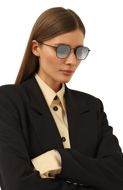 Шоры на этих очках перешли из сугубо функциональных деталей в разряд деликатных акцентов. Узкие элементы из ацетата с черепаховым рисунком контрастируют с полированной стальной оправой, не перетягивая на себя все внимание. С ними рифмуются полимерные накладки вокруг геометричных линз с серо-голубым градиентом, надежно защищающих глаза от ультрафиолета.