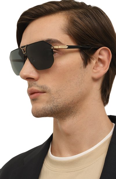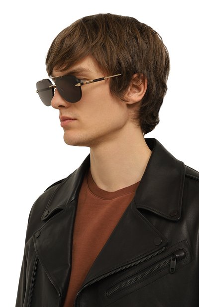 Безободковые солнечные очки выполнили из черного гладкого ацетата и позолоченного отполированного металла. Модель с регулируемыми носовыми упорами декорировали брендированными элементами, отсылающими к фирменным ювелирным украшениям. Однотонные коричневые линзы с рифлением по окружности защищают от ультрафиолета и блокируют блики.