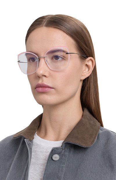 Для изготовления тонкой полуободковой оправы мастера марки использовали комбинацию ультрапрочных и при этом очень легких материалов: титана с серебристым покрытием и фирменного гипоаллергенного пластика SPX+. Рамки обозначили неоново-голубым узким кантом, вдохновленным макияжем. Узкие дужки закрепили безвинтовыми шарнирами, поэтому они комфортно прилегают к голове.