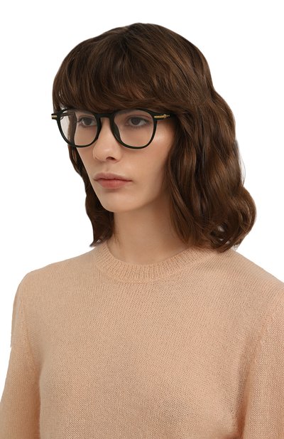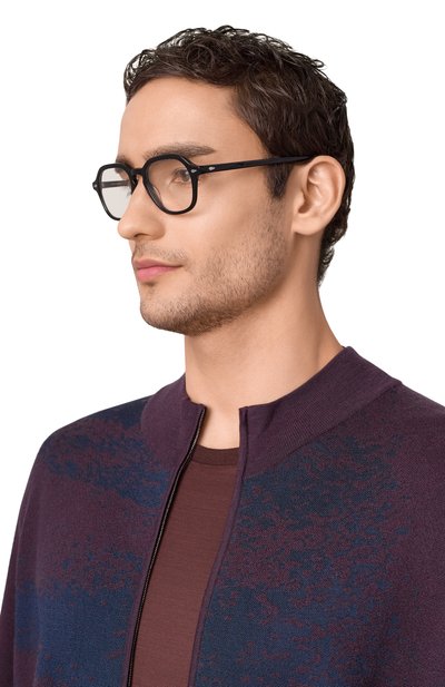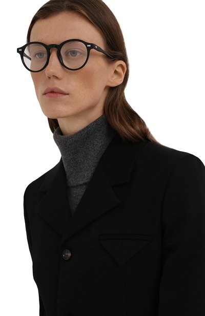 Черная лаконич ная оправа идеально поддержит формальный комплект и органично дополнит непринужденный повседневный образ. Для изготовления аксессуара выбрали легкий глянцевый ацетат, для узких рельефных вставок на тонких дужках и винтов — прочный титан.