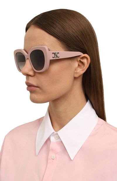Розовые солнцезащитные очки с легкой прямоугольной оправой из прочного глянцевого ацетата дополнены плоскими темными линзами, которые полностью блокируют ультрафиолетовое излучение и снижают нагрузку на глаза. Широкие дужки аксессуара дополнены поликарбонатными прозрачными вставками в тон.