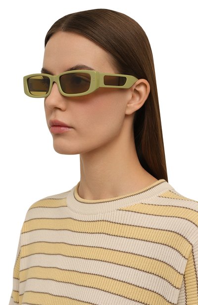 Для изготовления бежевых солнцезащитных очков с широкой прямоугольной рамкой использовали гладкий ацетат. Дужки акцентировали люверсами с золотистыми брендированными вставками. Светлые розовые линзы полностью защищают глаза от ультрафиолета.