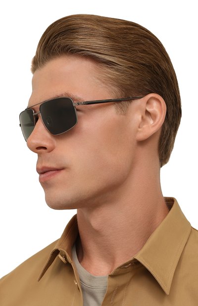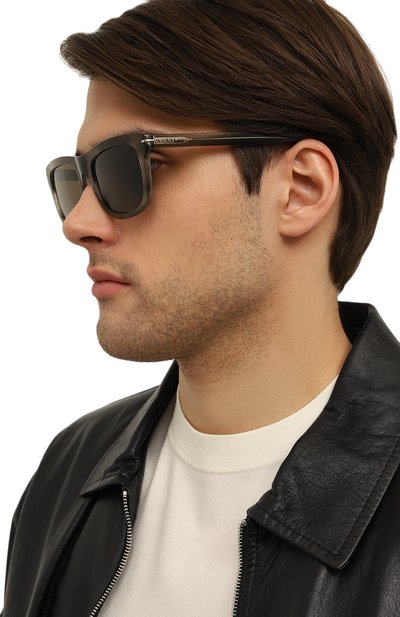 Серые солнцезащитные очки изготовили в сотрудничестве с командой Officine Générale. Для изготовления модели использовали прочный ацетат, быстро перен имающий тепло кожи. Однотонные полупрозрачные линзы из поликарбоната блокируют УФ-излучение.